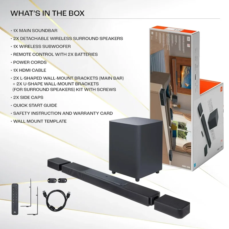 - Box contents: 1 x JBL SB 1300 Soundbar, 1 x Wireless Subwoofer, 1 x Remote Control (batteries included), Power Cables (up to 8 cables depending on regions), 1 x HDMI Cable, 1 x Wall Mount Kit with Screws
