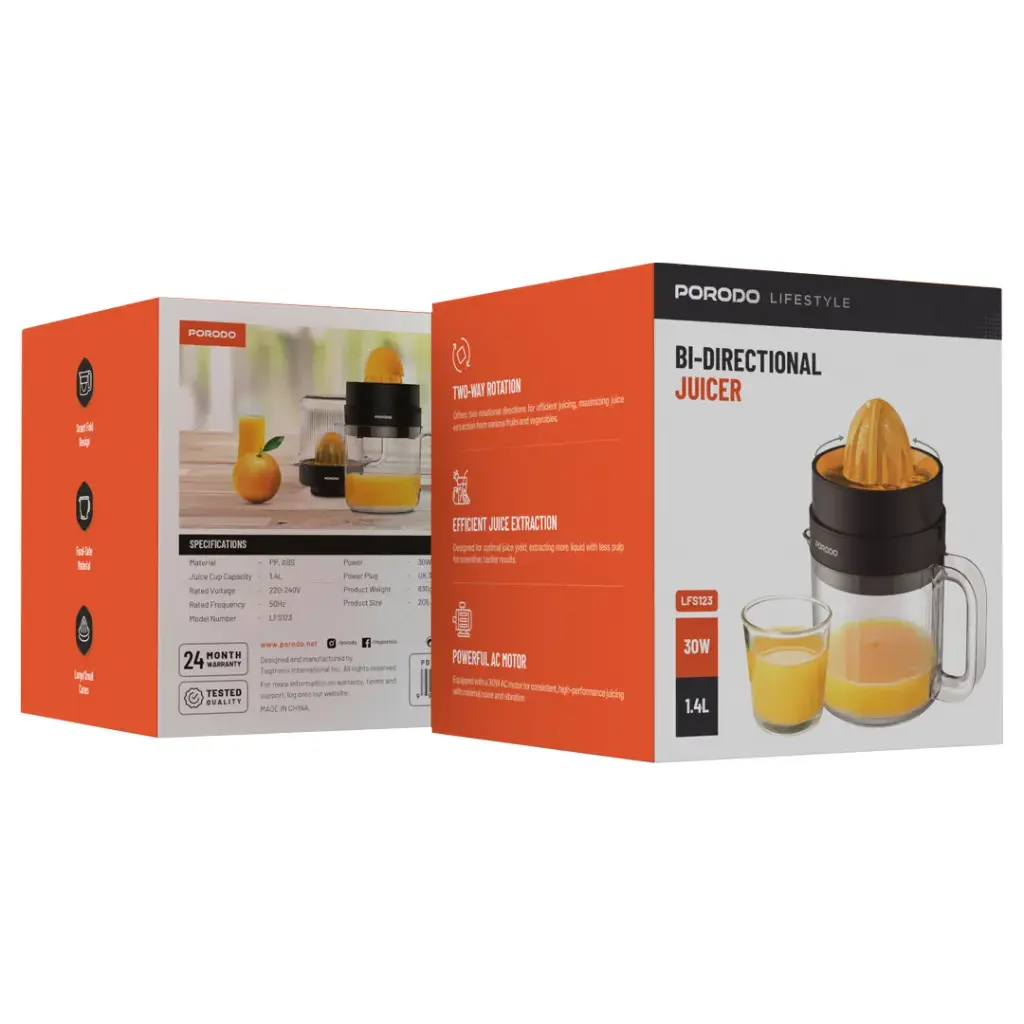 The Porodo Lifestyle Bi-directional Juicer performs efficiently in juice extraction, whether intensive or versatile. Made of only food-safe materials like PP and ABS, it has a 1.4L juice cup capacity, which is enough for preparing a huge batch of fresh juice. Its power rating is 30W, which operates efficiently on a power source between 220-240V and incorporates a UK 3-pin plug. The juicer has large and small cones, so you can juice as many kinds of fruits as you want. The bi-directional rotation guarantees that you will extract the maximum juice possible, while its smart fold design allows for easy storage. Users wishing to make that quick juice or large batches are guaranteed silky smooth, effortless performance. Ideal for any kitchen, it’s all about functionality in a small space so that juicing can be enjoyable.
